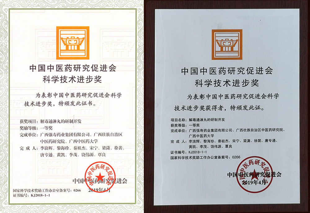 廣西強壽藥業(yè)集團有限公司獨家研發(fā)生產(chǎn)的治療非淋民族藥——解毒通淋丸榮獲2018年中國中醫藥研究促進(jìn)會(huì )科技進(jìn)步一等獎(省部級獎項,一等獎項類(lèi)別中排名第1位)。