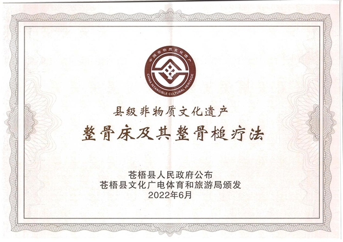 熱烈祝賀廣西強壽藥業(yè)集團有限公司整骨床及其整骨槌療法喜獲縣級非物質(zhì)文化遺產(chǎn)項目。證書(shū)由蒼梧縣人民政府公布,蒼梧縣文化廣電體育和旅游局頒發(fā)。